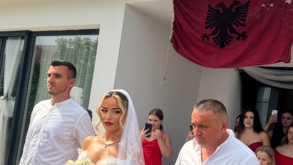 Pamjet nga ceremonia e dasmës tregojnë flamurin historik të vendosur pranë nuses, duke e bërë këtë moment një përzierje të gëzimit familjar dhe një kujtim kombëtar.