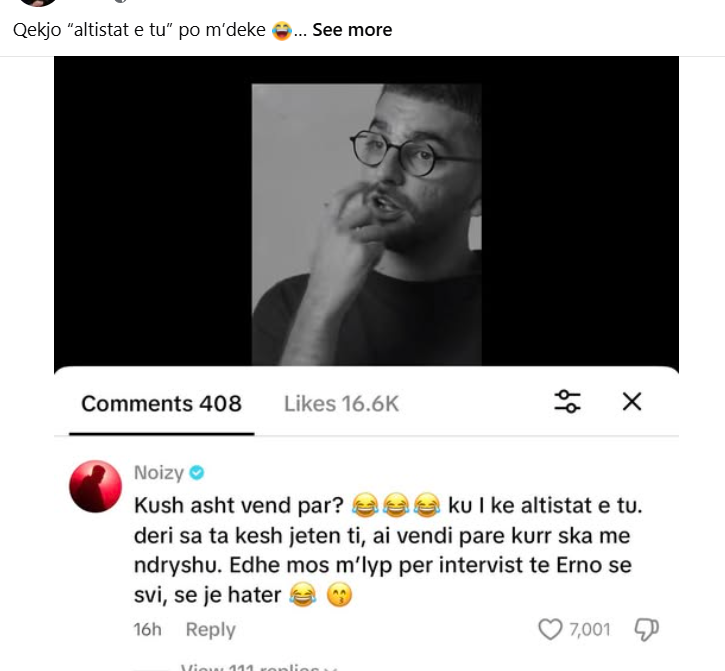 “Kush asht vend par? ku i ke altistat e tu, deri sa te kesh jeten ti, ai vendi pare kurr ska me ndryshu, edhe mos mlyp per intervist te Erno se svi, se je hater…”